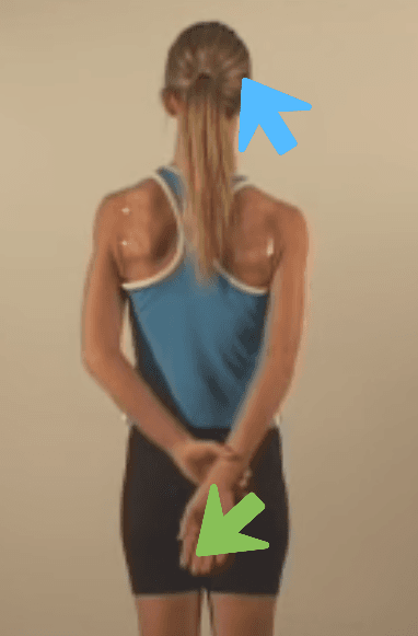 2. 손목을 엉덩이 아래로 당겨주고, 동시에 머리를 기울이며 스트레칭 시켜줍니다.